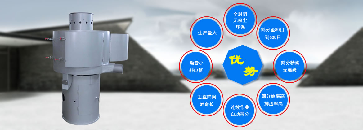 立式氣流篩采用空氣作載體、動能作功的作業(yè)原理。通過負壓氣流將物料與空氣混合后,進入篩機風輪中間,通過風輪葉片施加足夠的離心力,向桶型篩網(wǎng)噴射過網(wǎng),經(jīng)過蝸殼收集。而超徑物料不能過網(wǎng),由自動排渣口排出,從而達到快速篩分的目的。