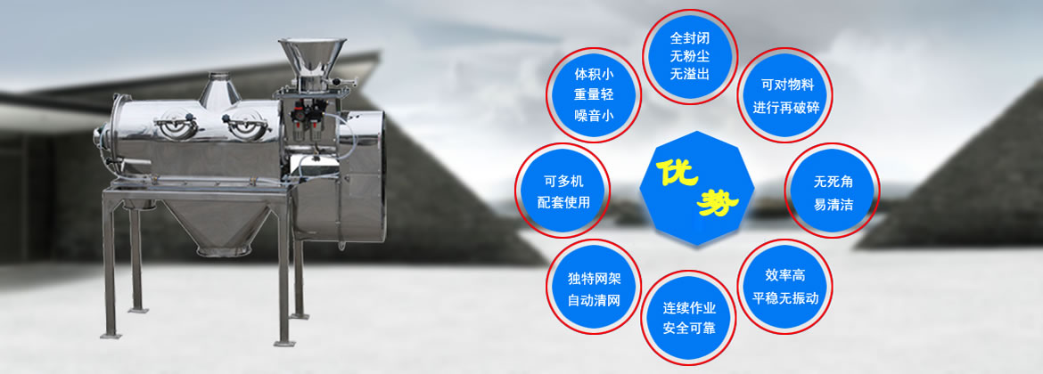 臥式氣流通篩適合150-500目各種粉狀物料的篩選分級,其篩分效率高、產量大、自動進排料、連續作業、防塵性好,使以往其它種類篩分機難以進行高精度篩分作業成為易事。經過對120-180目輕鈣、300目重鈣、400目活性鈣、300目山楂粉、320-500目鋅粉、500目氧化鐵黑等物料的篩分得到了較最佳篩分效果,可得到每平方米篩網面積每小時產量均在一噸左右,同時測得篩分精確度在95%以上,空氣含塵量低于10mg/m3。